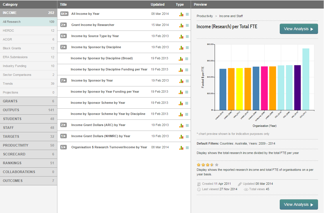 VIP-R enables organisations to compare their research performance both externally and internally using various criteria including; research income, research outputs, financials and postgraduate candidature as well as student/staffing demographics.
